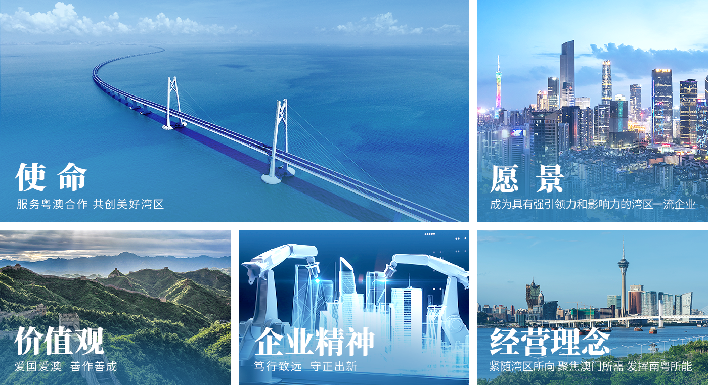 四十多年來,南粵集團在不同歷史階段中都尋找到自己的方位目標,薪火傳承、砥礪初心,用務實擔當回應時代呼喚,用拼搏奉獻回饋時代機遇,用接續奮斗擔負時代使命。一路走來,南粵集團率先打開一扇窗口,是服務改革開放的開拓者和先行者;在服務“一國兩制”偉大實踐中堅定豎起鮮明旗幟,是澳門持續繁榮穩定的維護者和捍衛者;成為粵澳不斷深化合作、共同繪就發展宏圖中的有力抓手和橋梁紐帶,是粵澳合作的促進者和貢獻者;在推動粵港澳大灣區互聯互通、助力澳門更好地融入大灣區中發揮了積極帶動作用和示范作用,是促進澳門經濟適度多元發展的引領者和探索者。在充分汲取不同發展階段優秀文化成果的基礎上,當前的南粵集團形成了具有深厚文化基因、鮮明時代特征和豐富企業特色的全新企業文化理念體系——堅持以“服務粵澳合作,共創美好灣區”為企業使命,踐行“愛國愛澳,善作善成”的價值觀,發揚“篤行致遠,守正出新”的企業精神,遵循“緊隨灣區所向,聚焦澳門所需,發揮南粵所能”的經營理念,向著“成為具有強引領力和影響力的灣區一流企業”的美好愿景奮力前行。